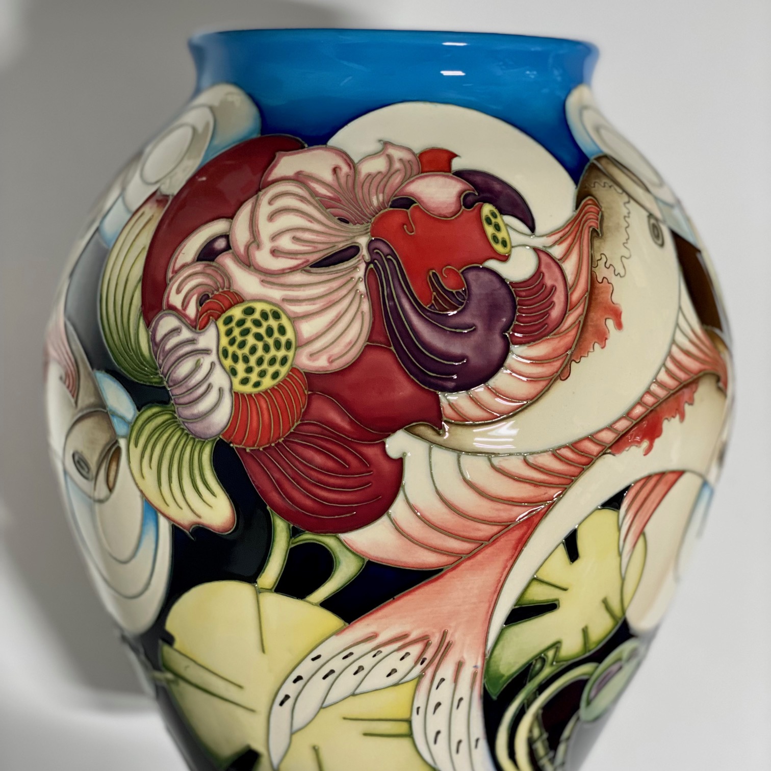 The vase is of a large bulbous form with tube lined decoration of Koi Carp and exotic brightly coloured flowers on a deep blue ground with a lighter blue ground to the top.