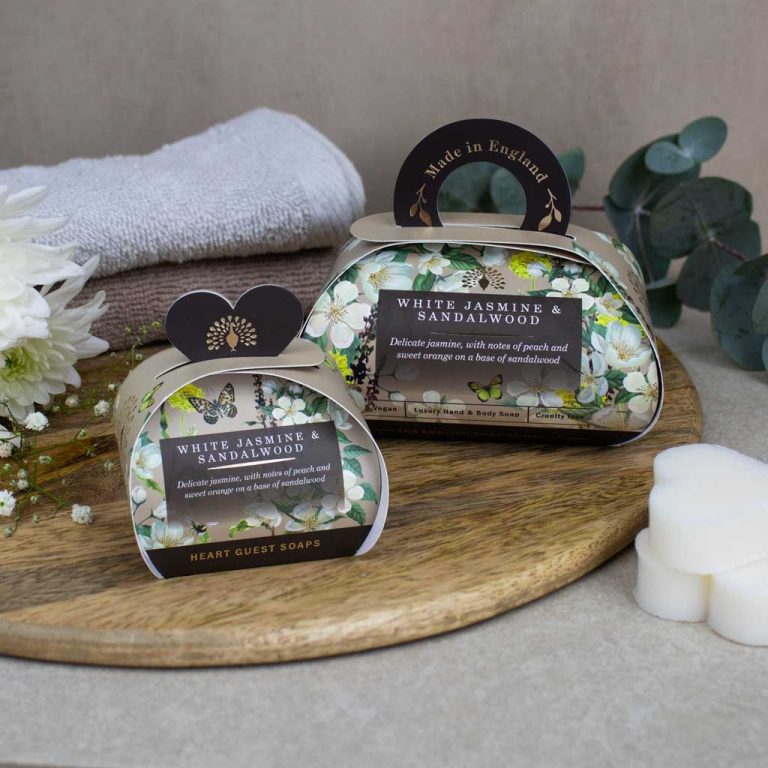Searching for that perfect gift for a friend or loved one? Look no further than our White Jasmine and Sandalwood Gift Soap: a generously sized soap bar presented in a beautifully designed gift box. The White Jasmine and Sandalwood soap has a floral heart of oceanic lily, white jasmine and violet leaf, underpinned with amber and musk base notes. Enriched with moisturising shea butter, this soap bar will nourish and moisturise all skin types.