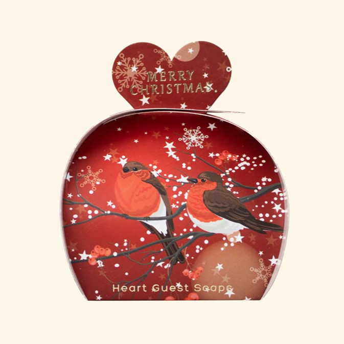 The Merry Christmas Guest Soaps contain three heart-shaped soap bars, perfectly packaged in a beautifully illustrated gift box. Enriched with moisturising shea butter, the Merry Christmas scented soaps have a Christmas greenery scent, a fresh perfume with a lovely soft base of delicate winter flowers, ivy and holly.