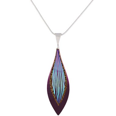 This elegant purple pendant is designed with dressing up in mind. Wear this to really show off your outfit to the very best. Luminous light and dark purple flowing lines gently nudge together on a blue background, held in a gold coloured dappled frame, are further enhanced by a deep purple border.