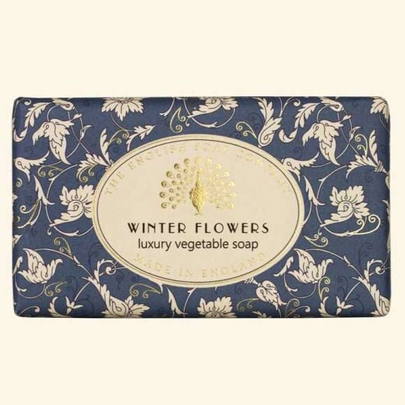 Winter Flowers fragrance soap bar. Wrapped in beautifully designed vintage-style festive paper, this luxury soap bar is enriched with shea butter to create a nourishing and moisturising lather, suitable for all skin types. A frosty, floral fragrance with leading notes of lilac flowers, orchid, ylang, rose and muguet, leading into a base of musks, vanilla and blond woods. A beautifully balanced perfume.