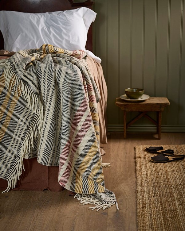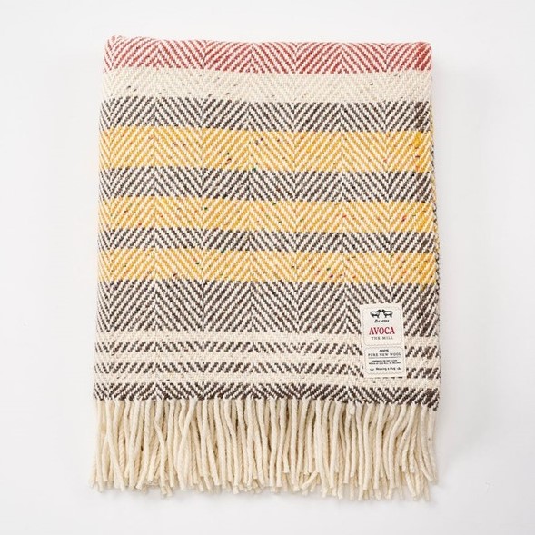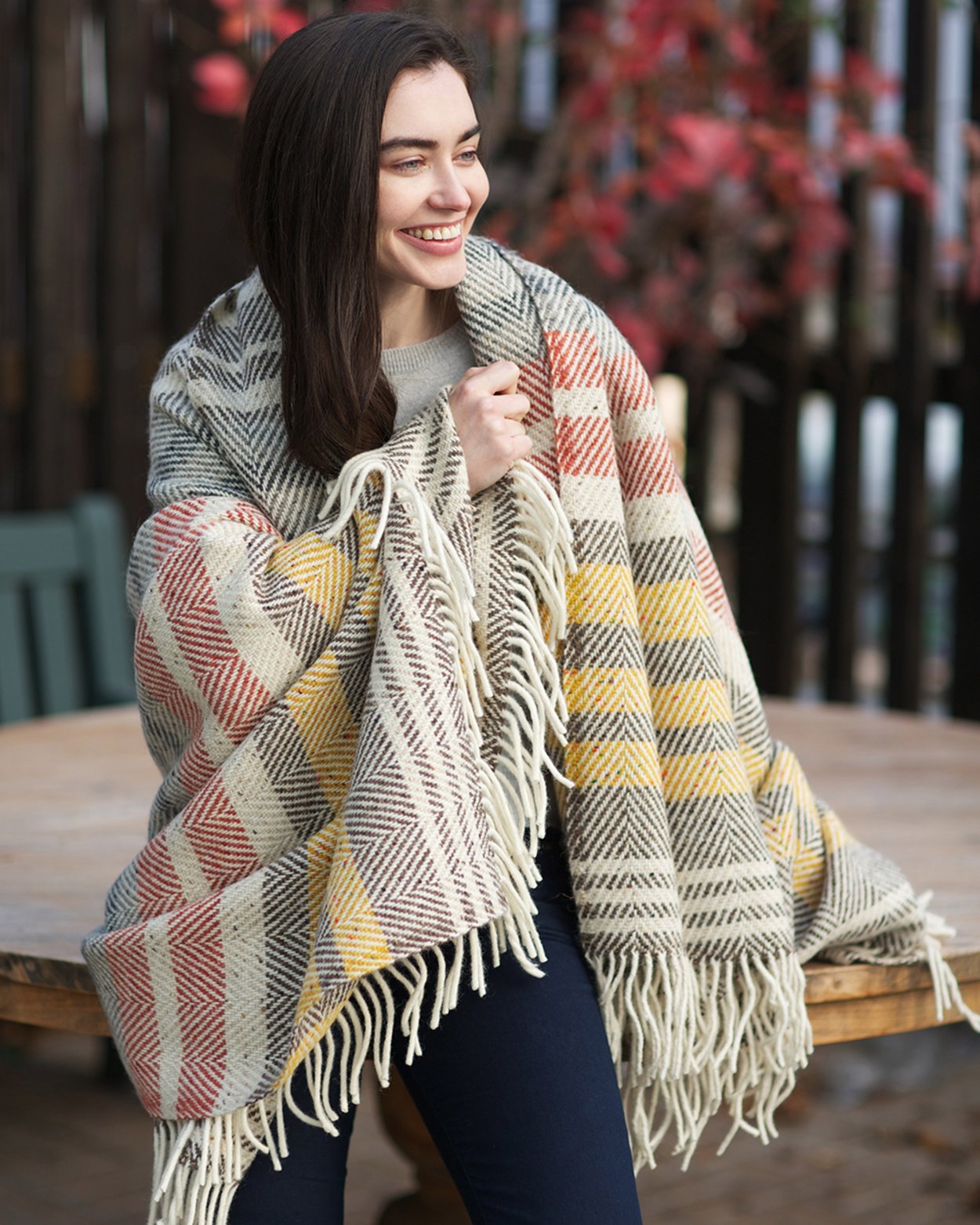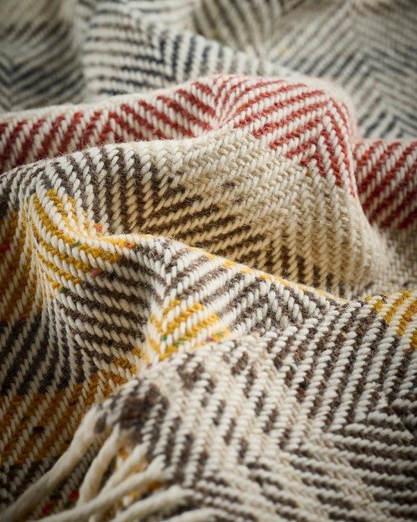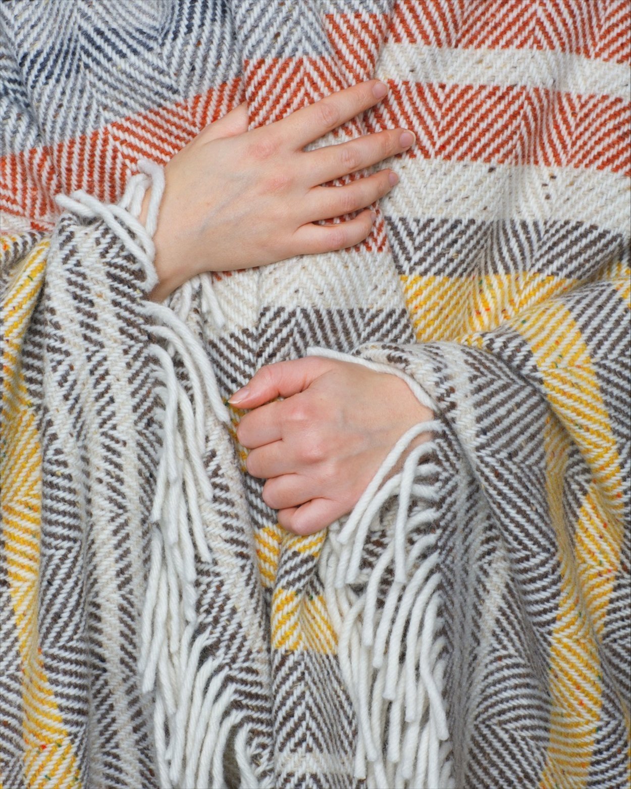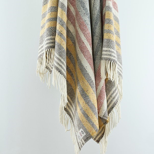 Contrasting stripes of warming red and cheerful yellow against neutral white and charcoal grey creates a homely and welcoming focal point within your home. Cast in our mill using thick and cosy Donegal yarns, distinctive by the flecks of colour visible in the weave. The eye-catching herringbone pattern of this piece showcases the skill of our master craftspeople and design team in blending a traditional aesthetic with contemporary style.