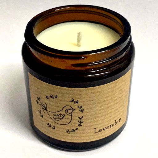 Lavender essential oil Soy Wax Candle in a Brown Glass Pot.