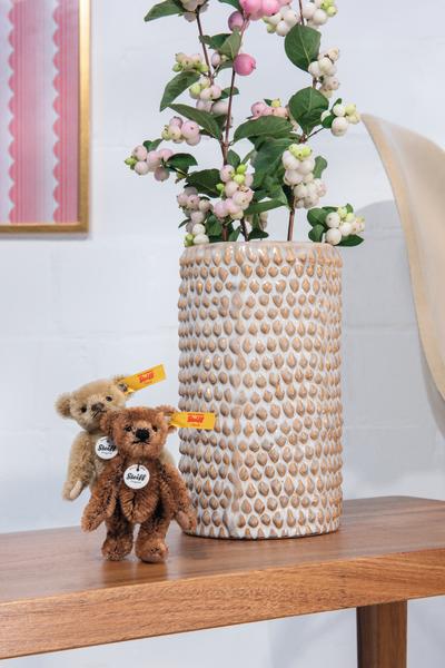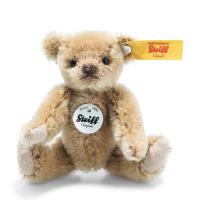 Where one feels at home, others will follow! Measuring 9 cm tall, our 5-way jointed Steiff Mini Teddy bear has been elaborately crafted from top-quality, slightly tousled, light brown mohair. His felt paws and soles come in contrasting pale beige, and he has a stitched, dark brown nose and gorgeous airbrushed details. His sturdy limbs even allow him to stand with a slight lean or to put his arm around one of his friends.