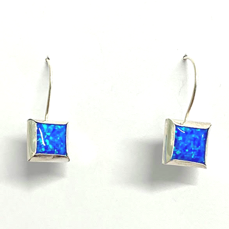 Description: A contemporary style sterling silver drop earrings set with a 10mm vibrant square dark blue opal. The back of this earring is set with a secure lock in clasp.