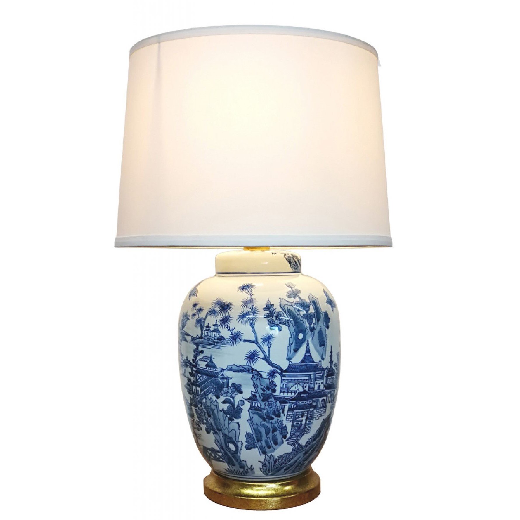 Tall Ginger Jar Lamp in white porcelain decorated with a classic willow pattern landscape scene in blue. Constructed from a 30cm porcelain jar mounted on a gold-foiled wooden base and carrying an off-white coloured, styrene backed linen shade.
