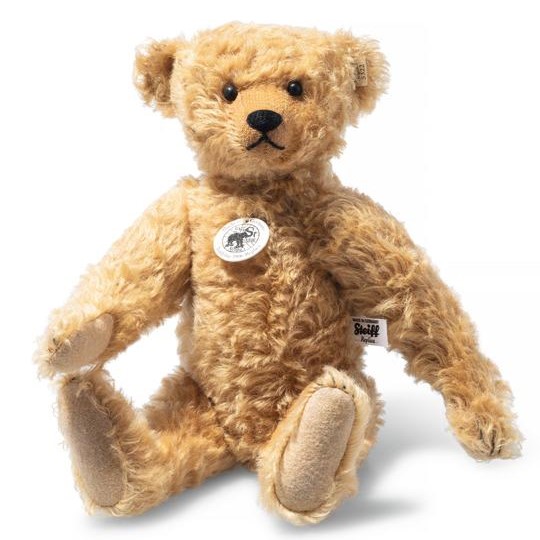 This gorgeous replica based on an original from 1906 is striking for its unique gold dusting, slightly orange shade. In the days of the original, all colours were described as white, blond or brown, which was understood to mean a variety of shades. This adorable Teddy bear is a charming companion who proudly wears the original replica ear tag and is equipped with a squeaker.