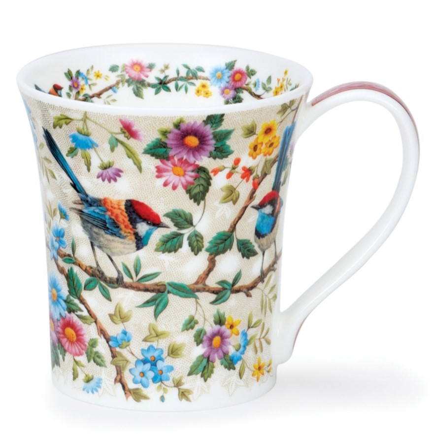 Satori is a beautifully, illustrated mug featuring sophisticated birds and pinky blue florals scattered over branches on top of a mass of 22 carat gold details and dots. This design features a vibrant pink handle..
