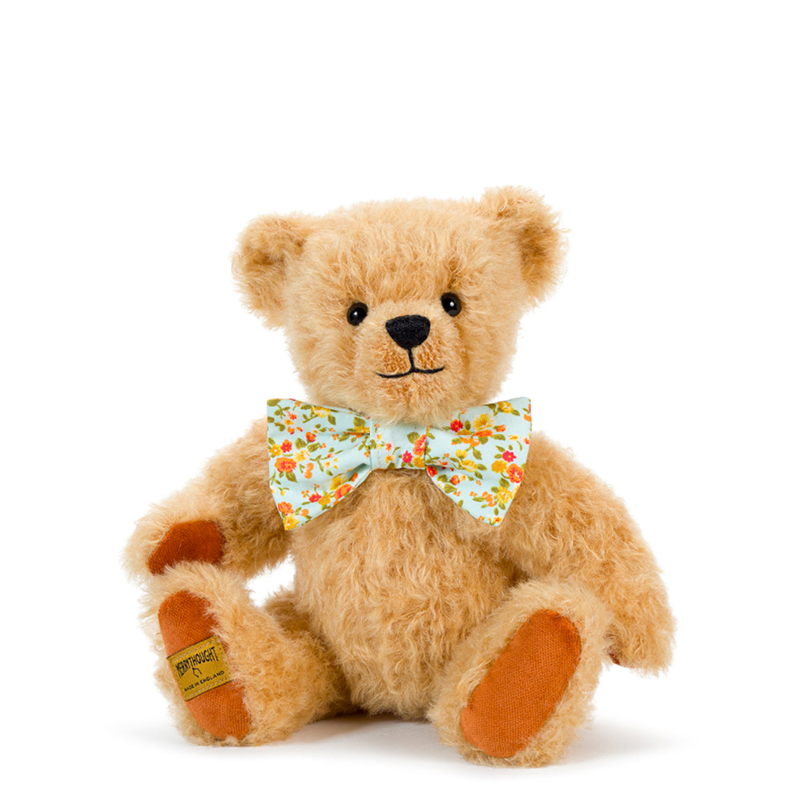 Hand-made from warm-gold tousled mohair plush, this cheerful companion is complemented by terracotta pure cotton velvet paws, and accessorised with a delightful floral cotton bow tie which is secured with a stud fastening - the perfect accompaniment to his sunny smile!