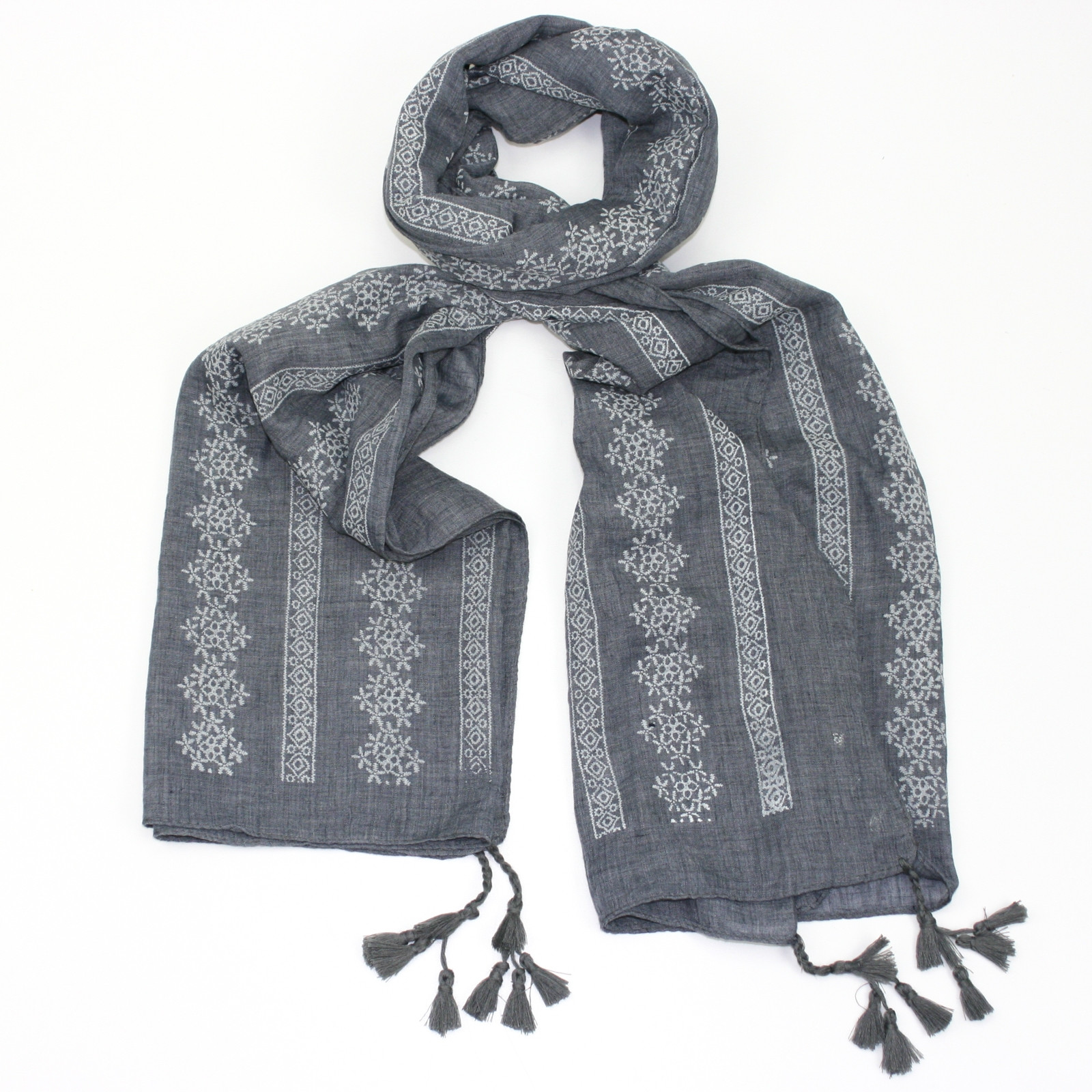 This cotton blend scarf has embossed floral detail with delicate tassels
