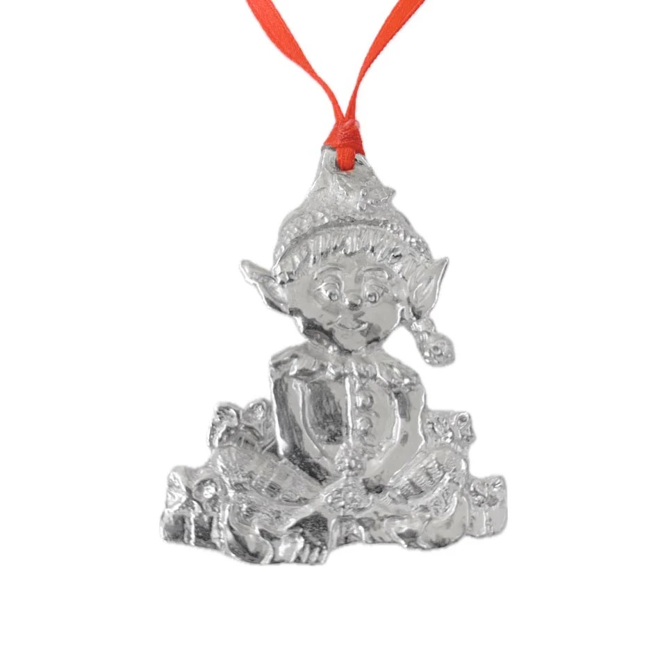 This 2024 Christmas Decoration features a mischievous Elf, expertly handcrafted from pure Cornish tin. Adorned with stripy tights and a pointy hat sitting amongst a pile of presents, this ornament is a must-have for any tree.