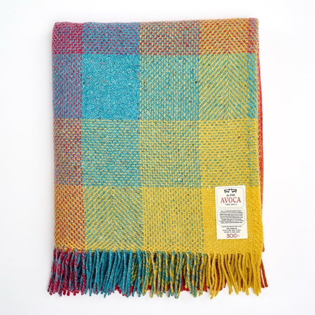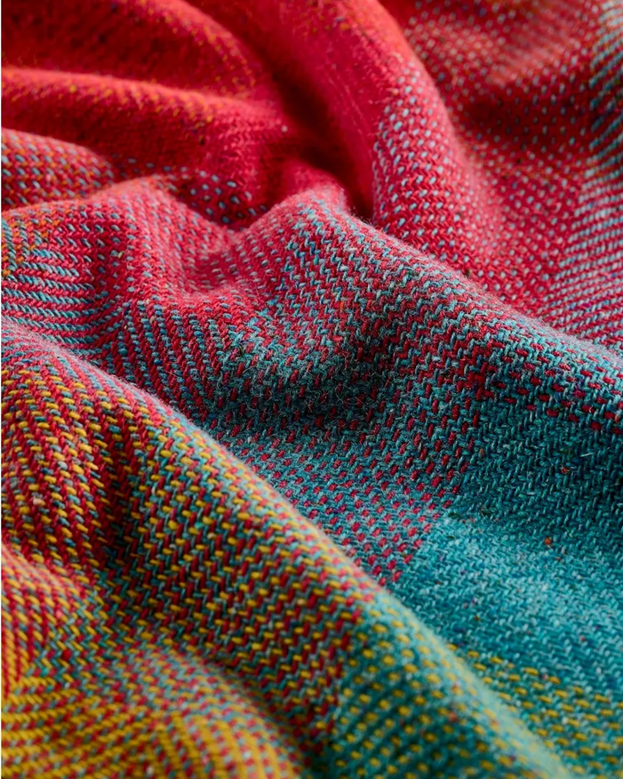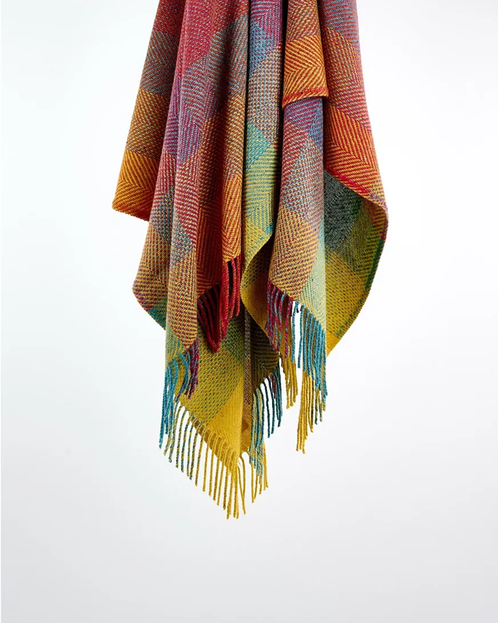 Add a contemporary, yet heritage touch of luxury to your home with our Pluto Mohair Tweed Throw. A nod to our classic Spectrum design with a herringbone twist, it features colour-and-weave effects in the pattern, creating an overall gradient design in lively and vibrant shades of yellow, cyan, paprika, and pink. Crafted from a 10% mohair and 90% pure new wool bespoke yarn, custom spun for Avoca in Co. Donegal, that features the iconic Donegal fleck.