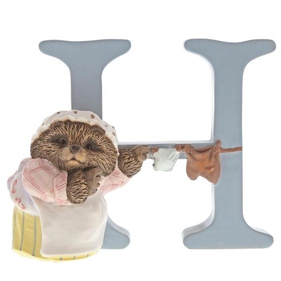 This Beatrix Potter Letter H of Mrs Tiggy-Winkle figurine forms part of the Beatrix Potter alphabet collection of figures. You can enjoy the entire cast of beloved children's characters from the acclaimed works of Beatrix Potter from these letter figurines. The blue alphabet letter H features the hedgehog washer-woman Mrs.Tiggy-Winkle dressed in her pink petticoat, apron and mop-cap.
